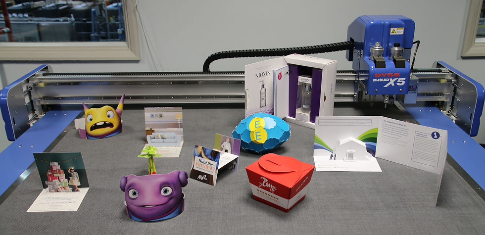 The company produces over one billion statement images each year; it is responsible for 836 million posted mail packs that sees every UK household receive a DST printed mail every 13 days. Furthermore, the company picks and packs over 828,000 items each month, and its customer base reads like a 'who's who' of the retail, banking and service sectors. Dealing with such staggering quantities, it’ is no surprise the company's busy design department at the Nottingham facility needed to upgrade its ageing sample cutting machine to a DYSS X5 digital cutter.