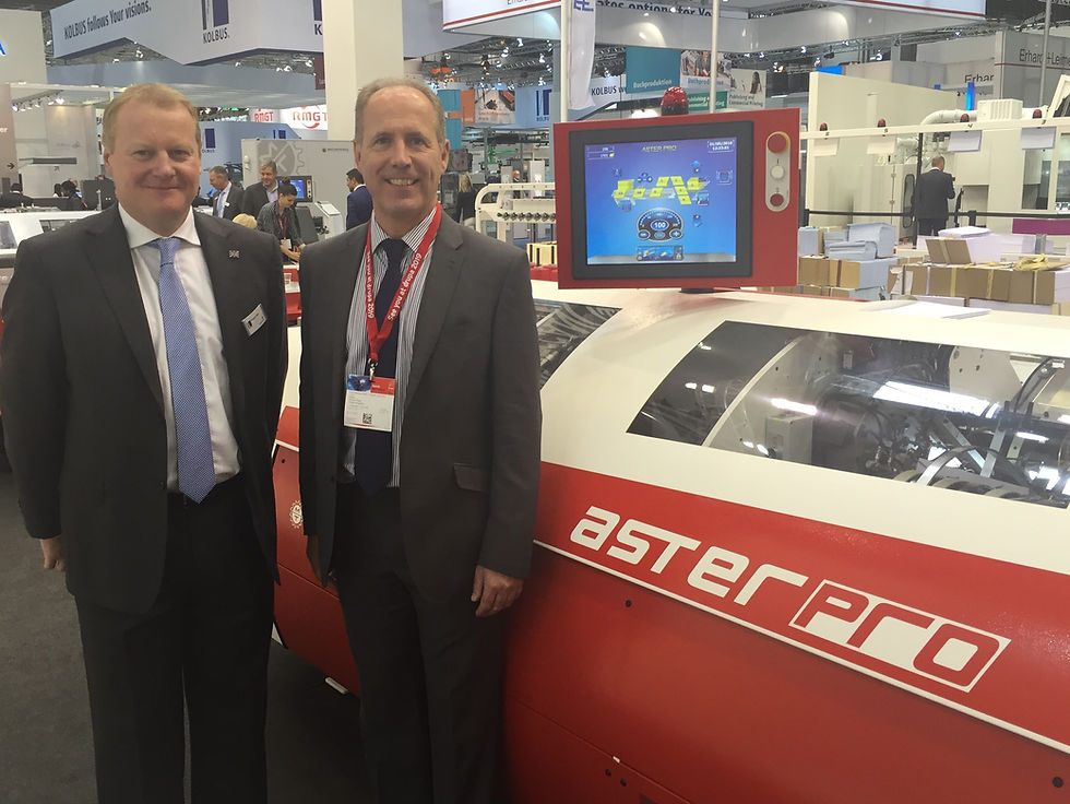 Jonathan Lewis, Gomer Press managing director and Greg Bird, director of Sales, Kolbus UK, with the new Meccanotecnica Aster Pro at drupa.