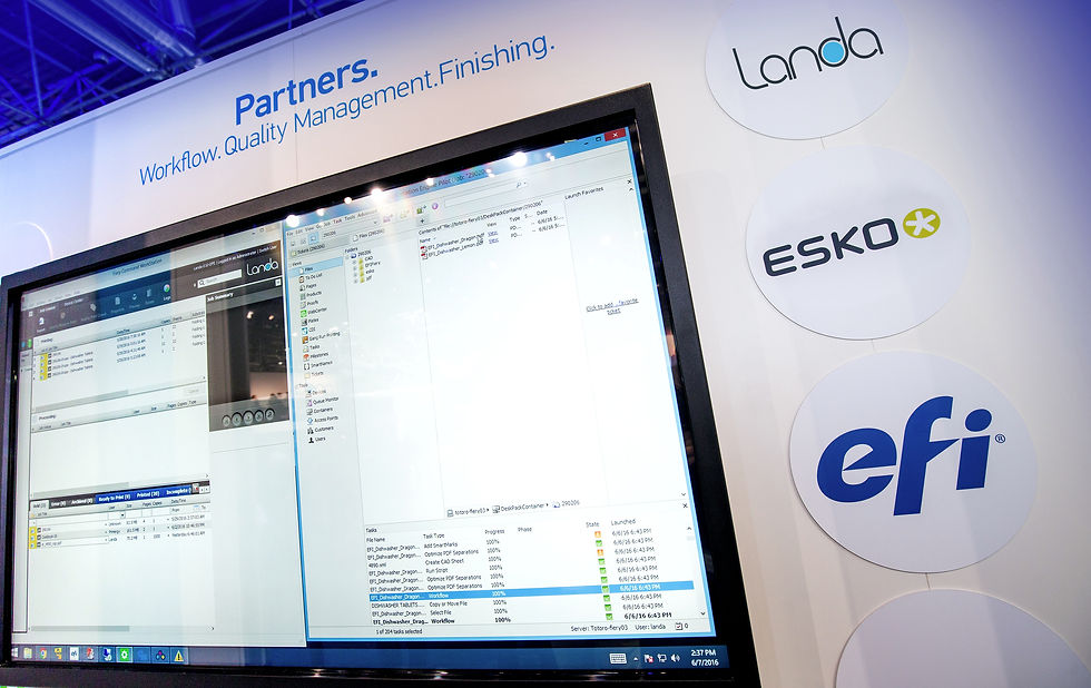 At drupa, Esko and Landa showed bi-directional connectivity from the MIS (EFI Packaging Suite with Radius ERP software at its core) to Esko Automation Engine to the Landa DFE powered by EFI Fiery technology. Esko Automation Engine, including Esko Color Engine for colour consistency, is further complemented with Esko WebCenter for online collaboration and approval, thereby integrating the entire folding carton production workflow from design to the production on the S10 at 13,000 B1 sheets per hour.