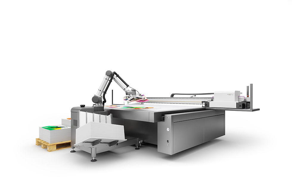 Working in concert with the printer, the robot handles extra shifts without supervision and takes over repetitive work. The user gains time for other tasks and has fewer hours to work, allowing greater utilisation of the printer and optimised delivery times.