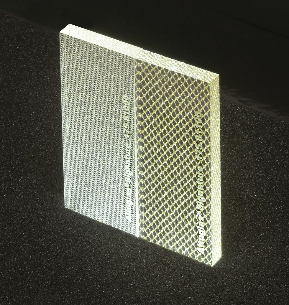 The range consists of large and small gold grid, large silver grid, large silver and black grid, non-woven, moire and lace. Altuglas Signature meets all the requirements of the necessary impact and heat resistance material tests required for architecture and design. It can be line bent or drape moulded and does not bleach. It can also be tinted, smoothed, pierced, screwed, or sawed and fabricates like wood, without the constraints of fibre.