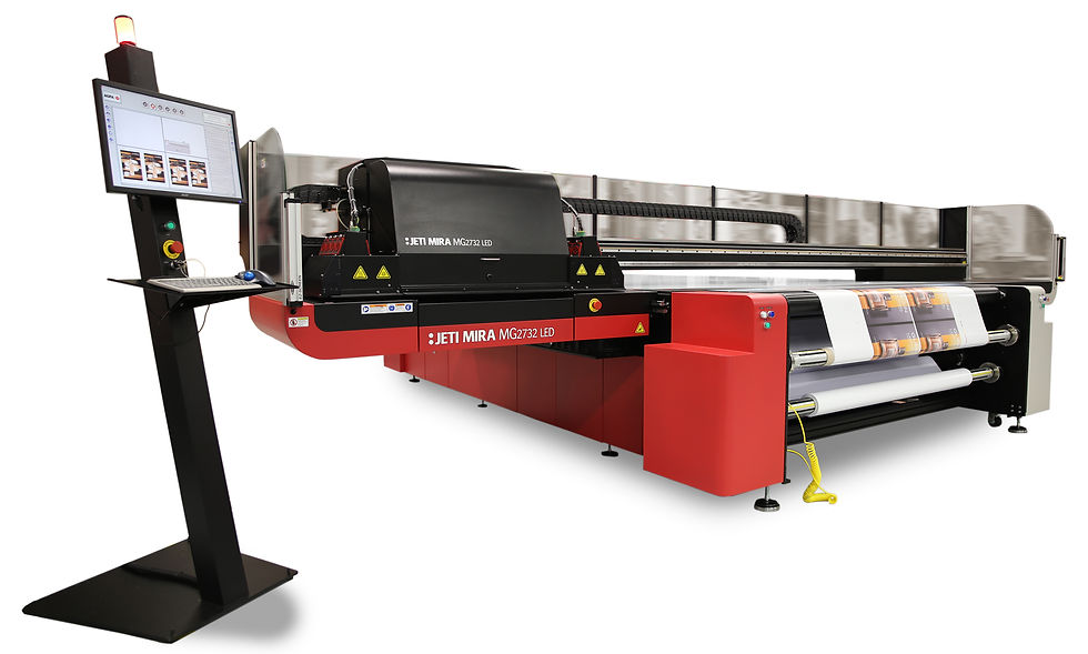Agfa Graphics’ Jeti Mira is a moving gantry flatbed printer specially designed to offer optimal flexibility. With up to 2.69 metre wide prints, print and prepare functionality, a dockable roll to roll option, two table versions, speed (up to 231 square metres per hour), six colour, white colour standard, highly pigmented UV inks and two rows of fast firing Ricoh inkjet printheads, the machine met that ‘optimal flexibility’. The latest printer upgrade now also includes UV LED curing technology, which involves significant advantages.